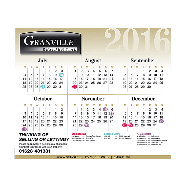 We generally start taking orders for our calendar templates in October, with final products going out in January. However, it’s worth thinking about when your audience is most ‘primed’ to receive and retain – most estate agents send them out during December or very early January.